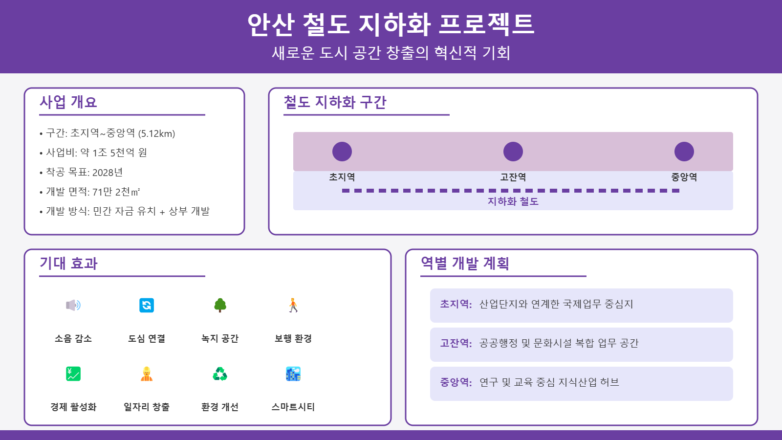 경기도 안산시는 국토교통부의 ‘철도 지하화 통합개발 선도사업’에 선정되며, 초지역에서 중앙역까지 5.12km 구간의 철도 지하화를 추진합니다. 현재 이 구간에는 초지역, 고잔역, 중앙역이 위치하고 있으며, 기존 선로가 도심을 가로지르며 단절감을 초래하고 있었습니다. 그러나 이번 프로젝트를 통해 이 문제를 해결하고, 도시의 새로운 성장 기회를 만들려는 것이 목표입니다.